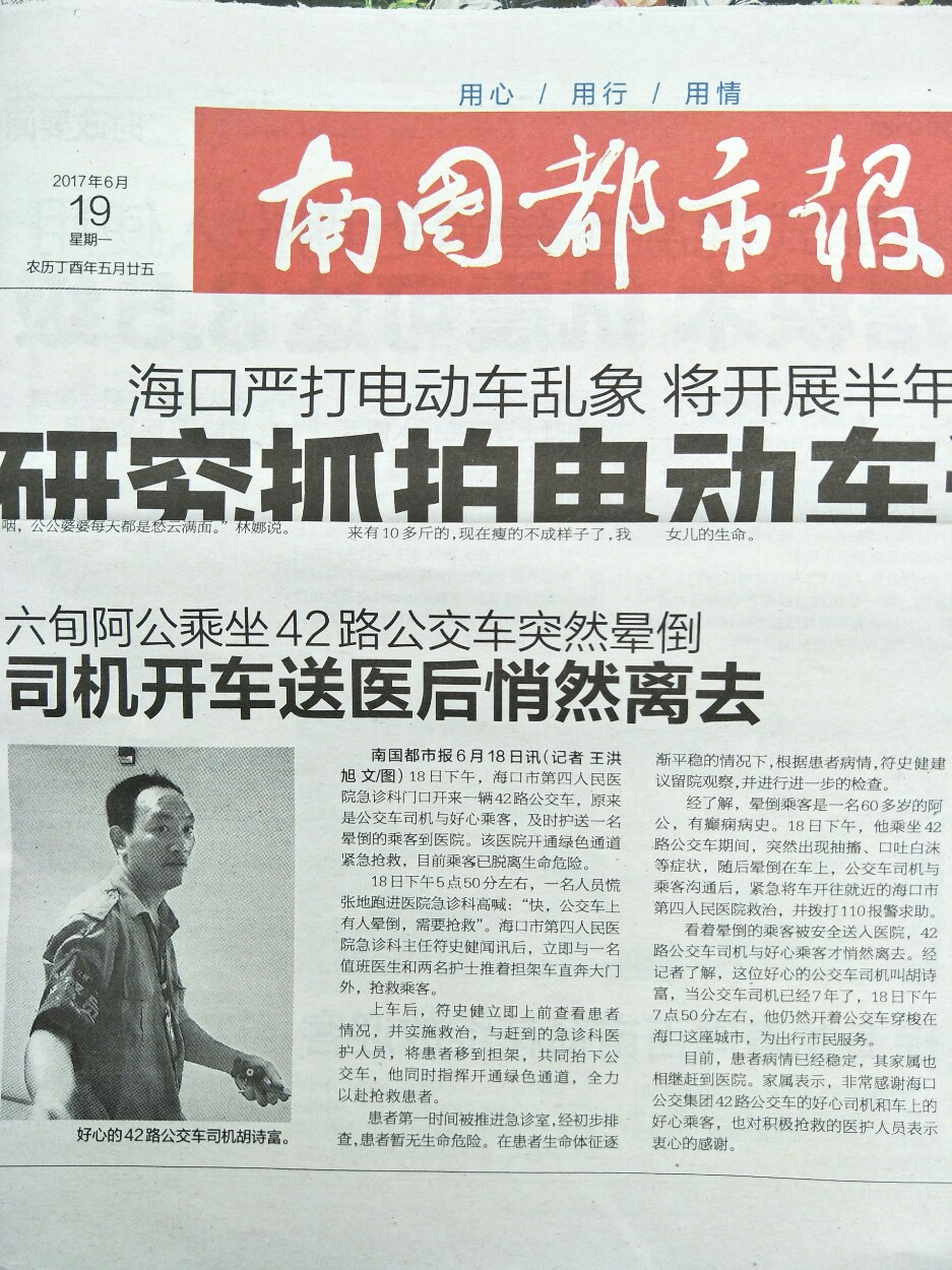 事件發(fā)生后,由于胡師傅沒(méi)有留名和聯(lián)系方式,媒體受醫(yī)院及暈倒乘客家屬委托在網(wǎng)上發(fā)布尋人啟事,尋找這位默默救人英雄,后經(jīng)確認(rèn),送醫(yī)的公交師傅就是??谑泄患瘓F(tuán)公交總公司42路駕駛員胡詩(shī)富,多虧胡師傅爭(zhēng)分奪秒,將公交車變身“救護(hù)車”。目前老人在醫(yī)護(hù)人員的救助下,已恢復(fù)意識(shí),身體也無(wú)大礙。